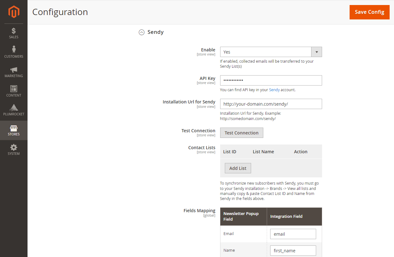 The Sendy Magento 2 integration is now configured. Next, you can move on to setting up your Contact Lists and Fields Mapping.